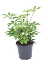 Schefflera, commonly called Umbrella Plant or Umbrella Tree, features long, shiny, oval green leaves that droop gracefully from a central stalk, resembling an umbrella.
