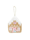 - Design: Classic gingerbread house shape with frosted white roof, pink bow, and candy accents