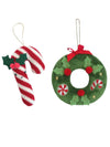 • Design: Includes one red-and-white striped candy cane with holly accents and one green wreath adorned with red berries, peppermint details, and a bow