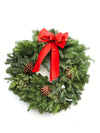 Bring home the classic look of the holidays with this lush, handcrafted wreath made from fresh evergreens. Its full shape, bright red velvet bow, and natural pinecones create a warm and timeless welcome for your front door all season long.