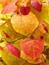 Flame Thrower Redbud produces lovely reddish-purple blooms in early spring. This Redbud earns its name as the heart-shaped foliage emerges in a beautiful display of burgundy red that turns yellow and apricot before maturing to green, often featuring multiple colors on the same branch for a spectacular "flame" effect.