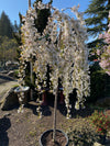 Snow Fountains ‘Snofozam’ features a graceful cascade of branches that become enveloped by snow-white blooms in mid-spring, creating the effect of a floral waterfall. This slow-growing, pendulous cherry is a standout specimen for small landscapes, offering refined dark green foliage that transitions into vibrant tones of gold and orange in the autumn.