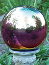Hand-blown glass gazing balls date back centuries to Victorian England and were used by the aristocracy to ward off evil spirits and witches because of their reflective properties, and hence the moniker "witches balls." Today they are used as ornamental centerpieces in gardens, flowerbeds, and yards and are designed to reflect the beauty of the surrounding landscape. This 10"diameter Arco Iris (Spanish for rainbow) garden globe has multiple hues from the color spectrum in it and because each is individually hand-blown, no two are identical.