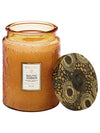 Voluspas unique coconut wax blend is hand-poured into a 18 oz. embossed glass vessel and is topped with a metal lid.