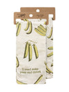 A cotton linen blend kitchen towel featuring all-over retro style pea pod designs and punny embroidered sentiment. Features a cotton tape loop in the corner for easy hanging. Machine-washable. Towel is packaged on a cardboard hanger with a hole to easily hang on rack.