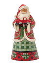 Cozy Holiday Warmth: Santa is dressed in a warm, festive outfit that features a buffalo plaid cloak (green and black check) over a red coat adorned with swirling green accents.