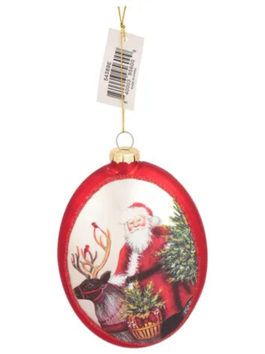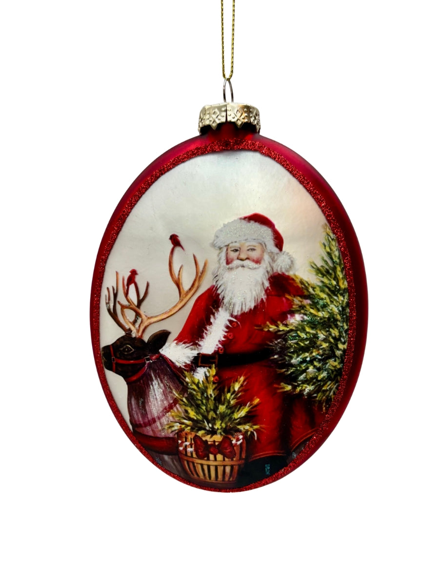 Matte Red Glass Oval w/ Santa & Reindeer Ornament