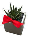 Minimalist Holiday Design: Features a striking Haworthia succulent, known for its forgiving nature and upright structure, nestled in a sophisticated metallic container.