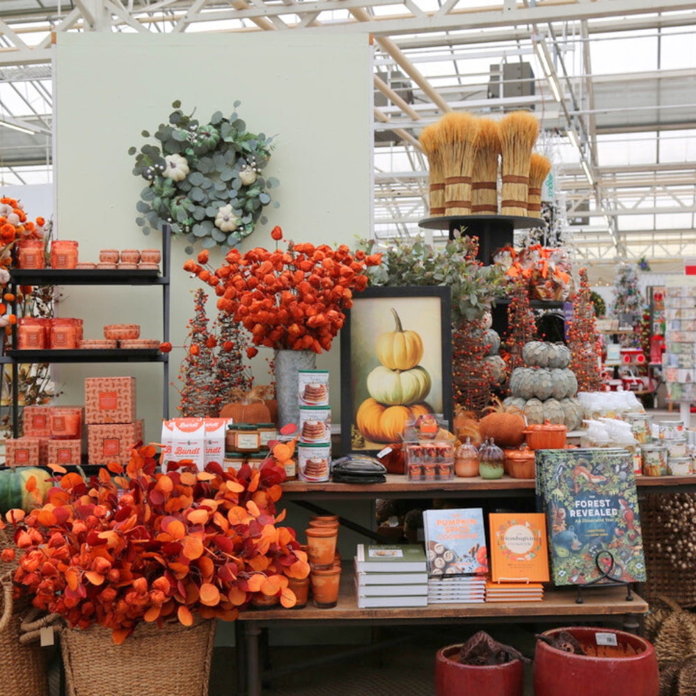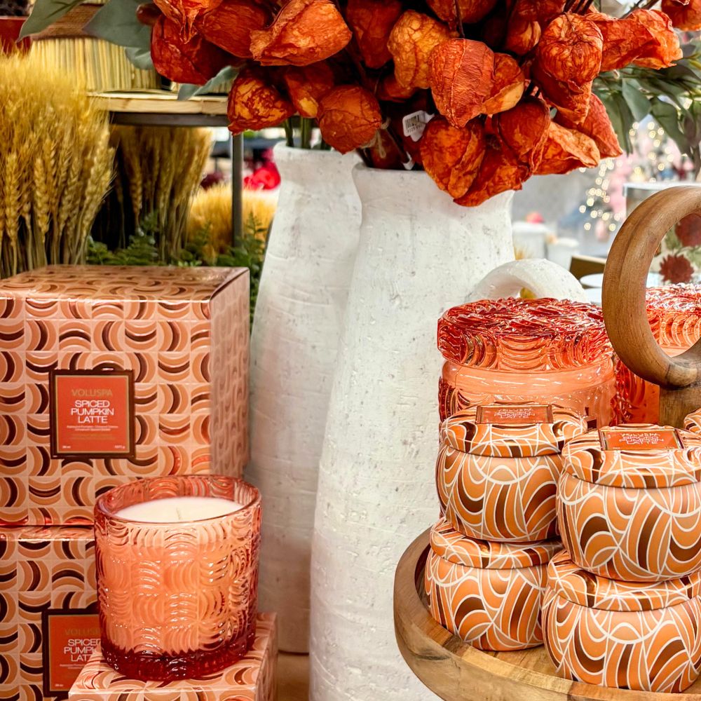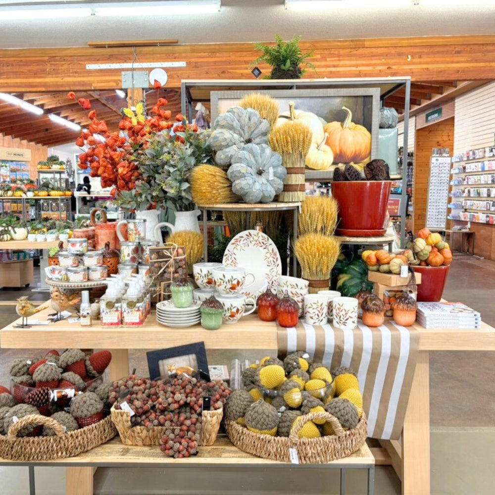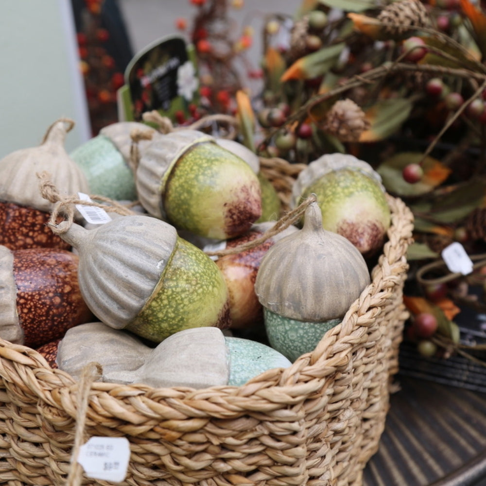 Find the must-have colors of the harvest bronze, orange, earthy brown and deep green. Beyond our unique pumpkins in glass, velvet and natural materials, be sure to pick up on this year's trend: acorns! We have them in every form knitted, glass, diffuser and candle perfect for your fall vignette.