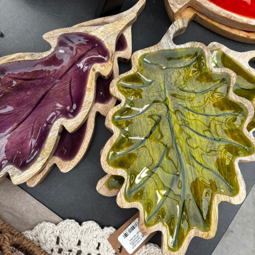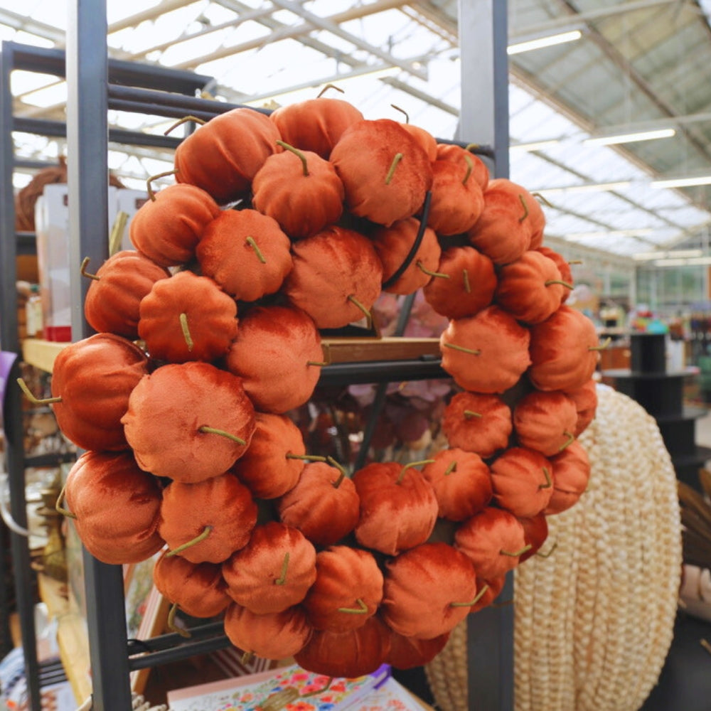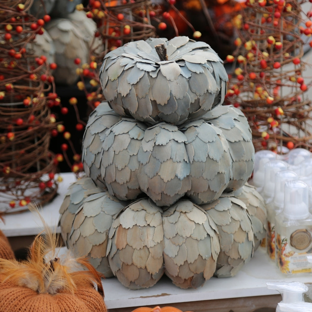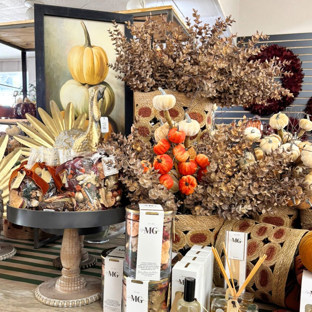 Find the must-have colors of the harvest bronze, orange, earthy brown and deep green. Beyond our unique pumpkins in glass, velvet and natural materials, be sure to pick up on this year's trend: acorns! We have them in every form knitted, glass, diffuser and candle perfect for your fall vignette.
