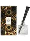 Voluspas unique coconut wax blend is hand-poured into a 18 oz. embossed glass vessel and is topped with a metal lid.