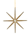 Each of the star's multiple points is intricately formed from fine gold-toned wire, meticulously wrapped with countless tiny, sparkling champagne-colored beads. These beads create a rich, textured surface that shimmers with an elegant, subdued brilliance. At the heart of the star lies a central mother-of-pearl or opalescent disc, adding a soft, iridescent glow that beautifully contrasts with the beaded points. A delicate gold thread hanger is attached for easy display.