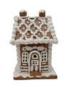 This charming miniature house captures all the magic of a classic gingerbread creation, complete with an irresistible, sugary-sweet appearance. Crafted with exquisite detail, it features a warm, gingerbread-brown finish generously dusted with sparkling "sugar" glitter that shimmers under the lights. Every edge and architectural detail, from the roof shingles to the window frames and door, is meticulously outlined with raised white "icing" swirls and patterns, making it look freshly baked and decorated.