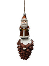This delightful ornament features a classic Santa Claus figure in his traditional red (or in this case, a rich, burnished copper-gold) suit, complete with a white beard, rosy cheeks, and a festive hat topped with a snowy pom-pom. But the magic truly begins where Santa's jolly belly traditionally would be his lower body transforms into a wonderfully textured, glitter-dusted pinecone!